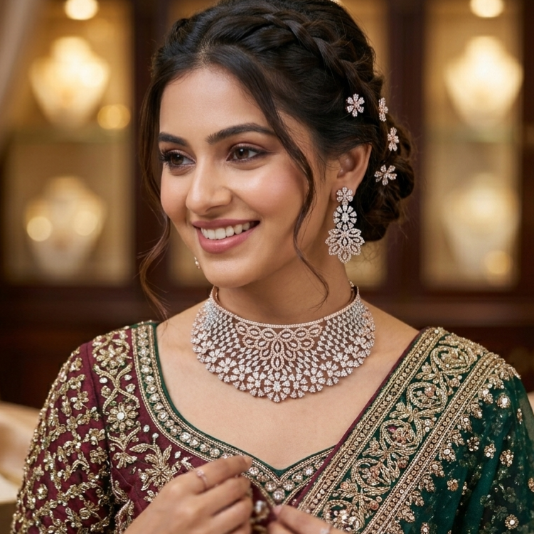 The central floral motif flows into a delicate lace of pavé-set stones, radiating timeless elegance. Accompanied by matching floral drop earrings, this set is designed for the modern bride or a high-profile gala.